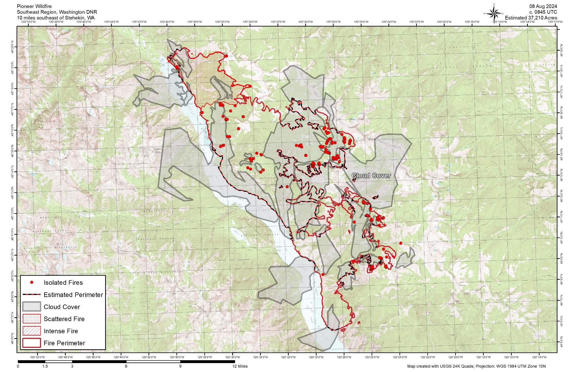 WEATHER AND SMOKE: There were scattered thunderstorms that impacted the Pioneer fire last night and this morning. Temperatures will be cooler today but remain unsettled with a 30 percent chance for showers and thunderstorms in the afternoon. Winds will start off light then become gusty from the northwest, especially along Lake Chelan. Temperatures will continue to cool into Tuesday with high temperatures in the upper 70s to lower 80s with drier conditions. Winds will remain breezy from the northwest with gusts of 20 to 25 mph possible in the late afternoon into evening hours.