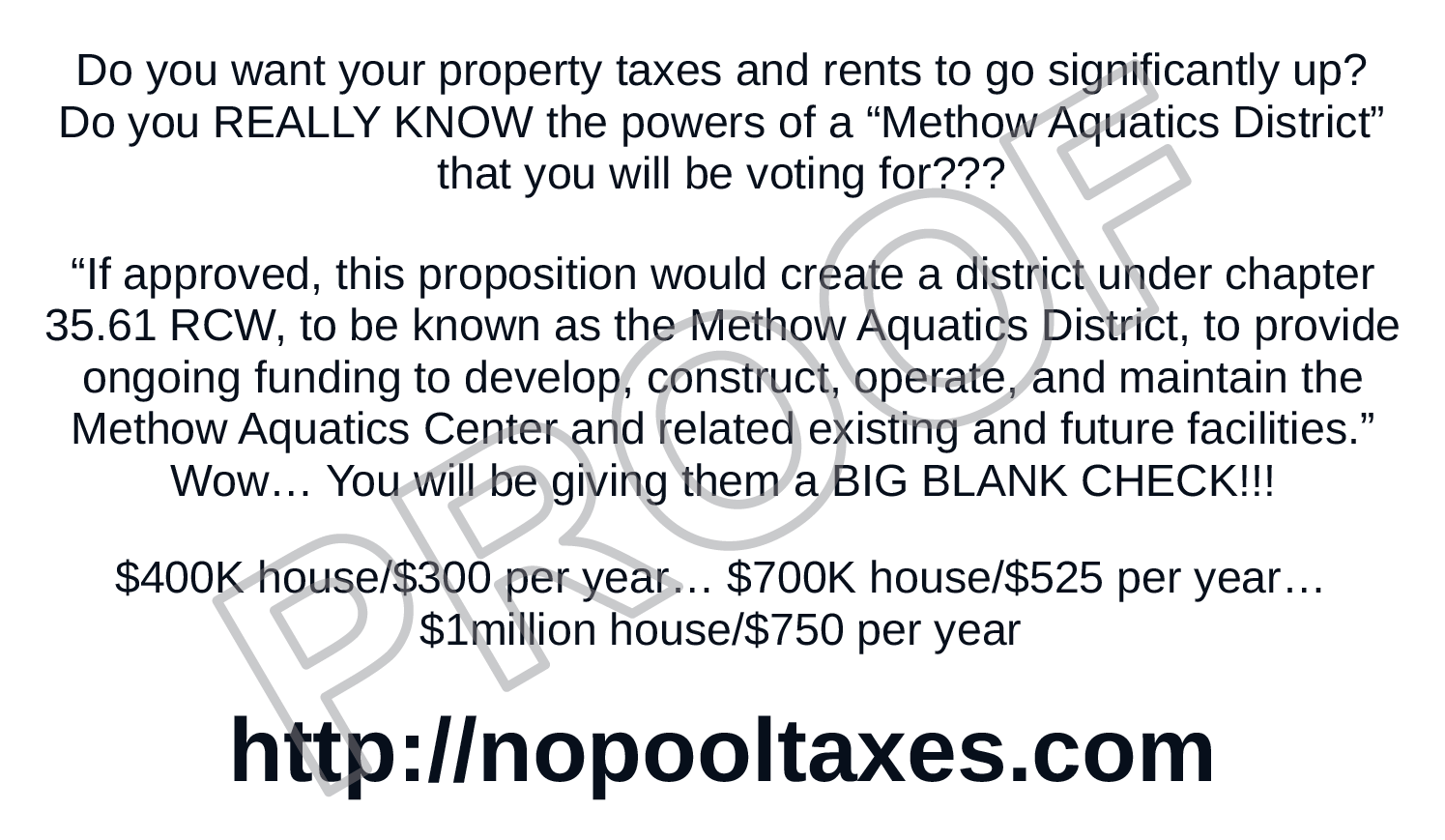 FOTP does not even have a final design nor a final cost for the future pool, but they will want us to vote on the formation of this very powerful and permanent Aquatics District. Proposition 1 will be on the November ballot if they get enough signatures by August 1, and is specifically for the formation of the Methow Aquatics District.