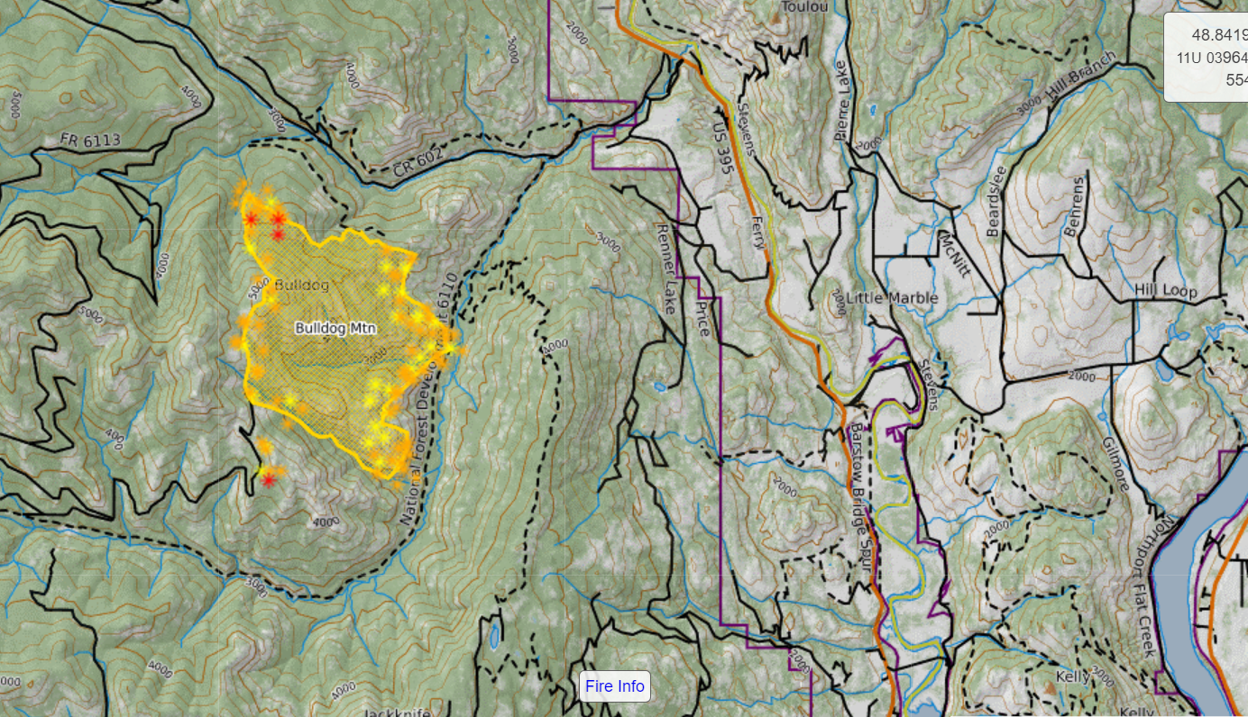 Closures: An area closure is in effect on Colville National Forest lands in the vicinity of the Bulldog Mountain Fire. For more information on area and road closures on the Colville National Forest, please visit: https://www.fs.usda.gov/Internet/FSE_DO ... 938379.pdf