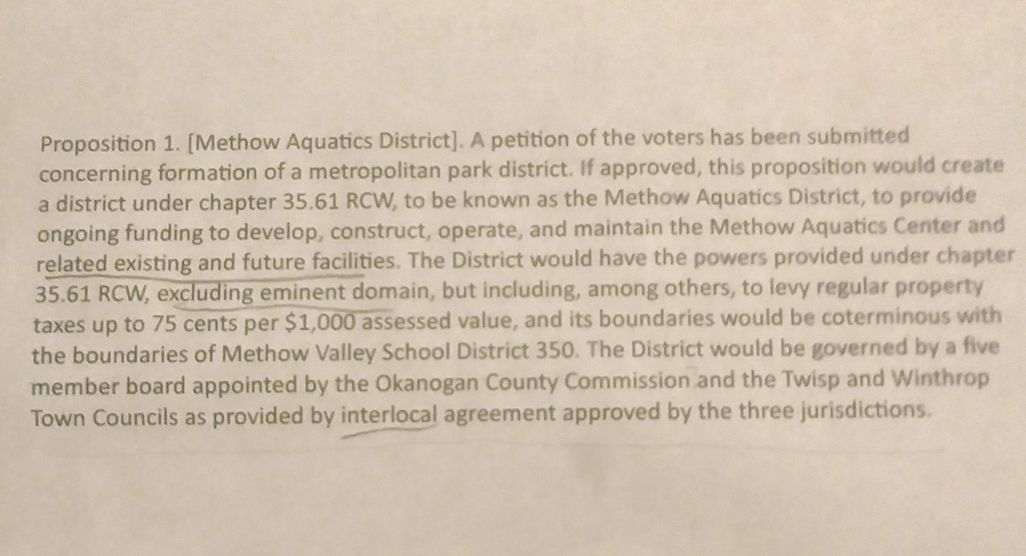In any case, the auditor will be sending the text next week in response to my emailA petition of the voters has been submitted concerning formation of a metropolitan park district. If approved, this proposition would create a district under chapter 35.61 RCW, to be known as the Methow Aquatics District, to provide ongoing funding to develop, construct, operate, and maintain the Methow Aquatics Center and related existing and future facilities. The District would have the powers provided under chapter 35.61 RCW, excluding eminent domain, but including, among others, to levy regular property taxes up to 75 cents per $1,000 assessed value, and its boundaries would be coterminous with the boundaries of Methow Valley School District 350. The District would be governed by a five member board appointed by the Okanogan County Commission and the Twisp and Winthrop Town Councils as provided by interlocal agreement approved by the three jurisdictions.