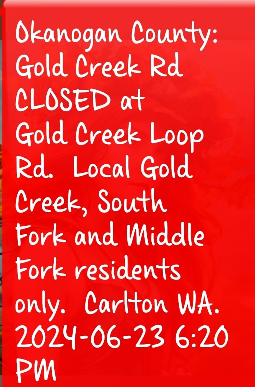 Gold Creek Rd CLOSED at Gold Creek Loop Rd. Local Gold Creek, South Fork and Middle Fork residents only. Carlton WA. 2024-06-23 6:20 PM