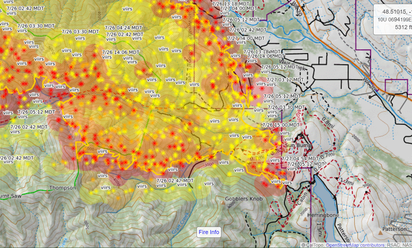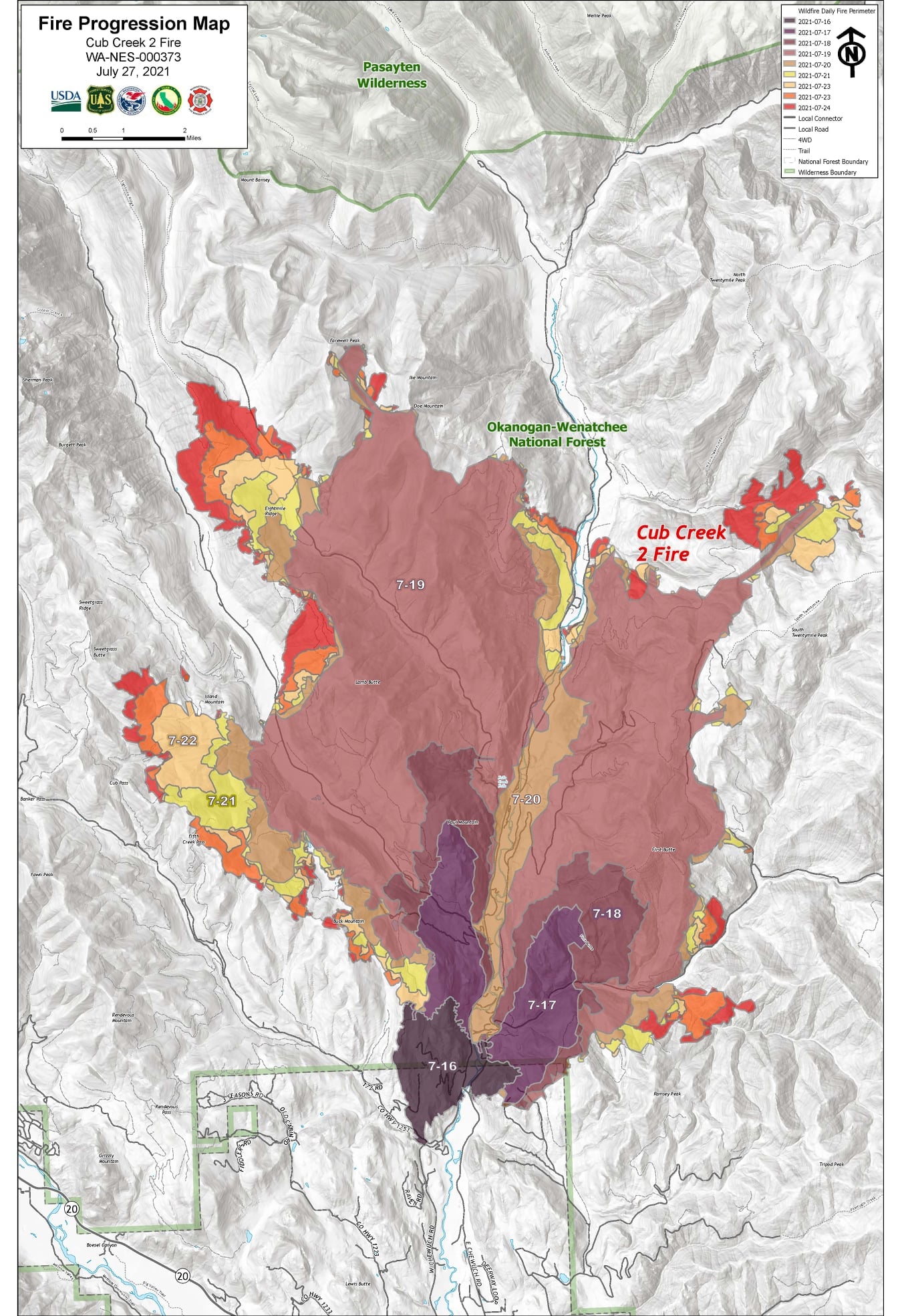 Cedar Creek Fire: The fire is currently estimated at 24,647 acres and 11% contained. Great Basin Team 1 and California Team 1 will be holding a joint public meeting tomorrow, Tuesday, July 27, at Mack Lloyd Park in Winthrop at 6 p.m. covering the Cedar Creek, Delancy and Cub Creek 2 Fires. An identical meeting with the same information will be replicated Wednesday, July 28 at Twisp River Park, 325 N Lincoln St. in Twisp at 6 p.m.
