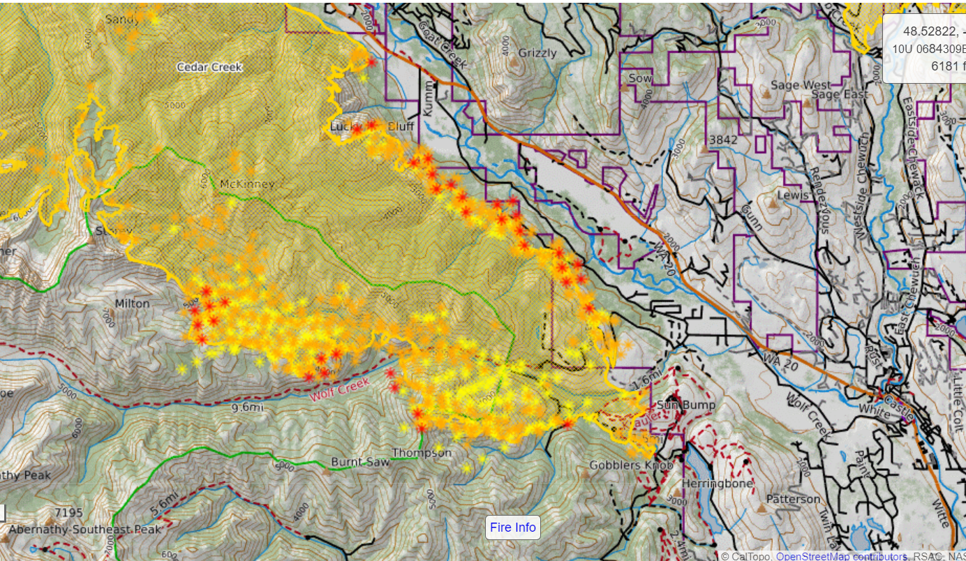 On the western edge, fire continues to creep into the high alpine along Silver Star Creek. In the northwestern corner of the fire, resources are patrolling along State Route 20 between Silver Star Creek and Early Winters Campground where fire has backed downhill to the road. In the northeastern corner, fire continues to back down Sandy Butte ridgeline in the Freestone area, but remains contained above Forest Service Roads 100 and 115. Firefighters are securing lines as fire backs down. Firefighters are mopping up and patrolling the eastern portion of the line between Looney Creek and Badger Creek.