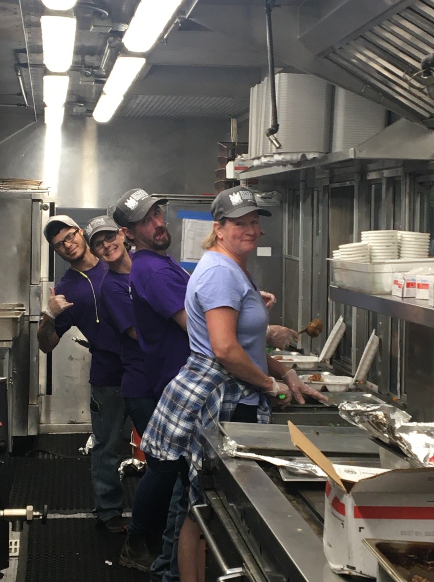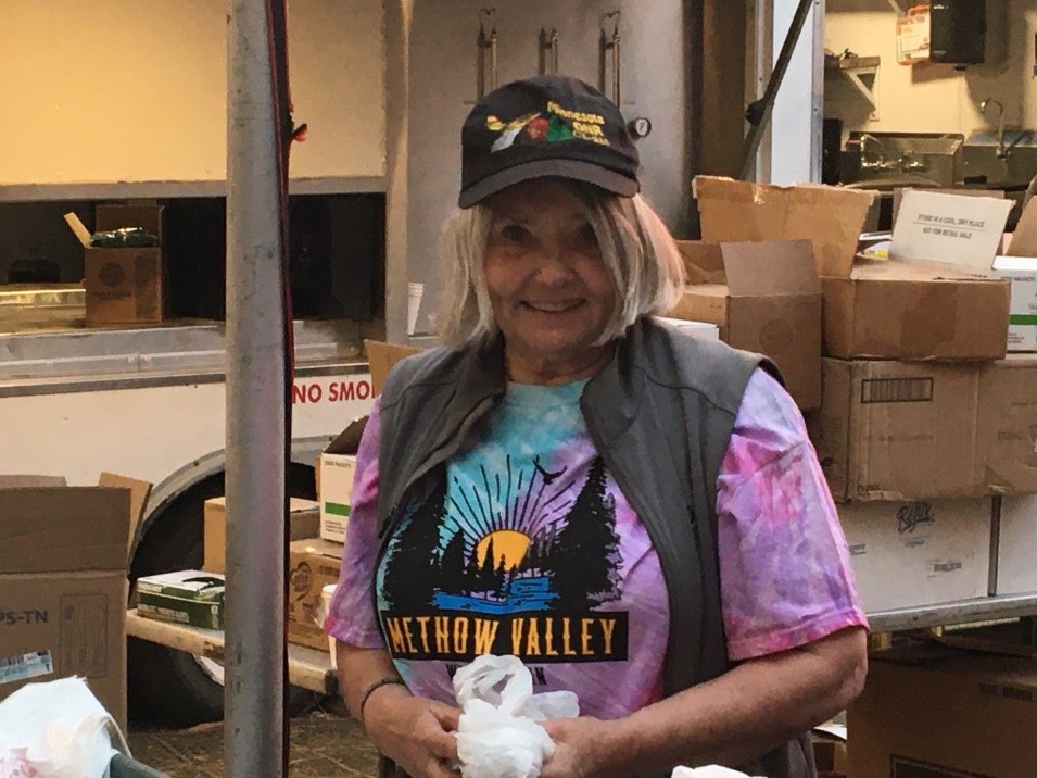 Another way of being “on the line”: The middle of July for many in the Methow Valley means spending time enjoying the beauty of this special community or maybe traveling and vacationing. As high temperatures and acutely dry conditions brought fire into the Valley, Kris Caldwell of Winthrop wanted to help. Unsure how, she asked around, and found Bishop Services, Inc., a food caterer, who welcomed her onboard as an employee. Now she spends her days preparing meals for more than 800 firefighters grateful for the comfort a hot meal and good nutrition give to their day.