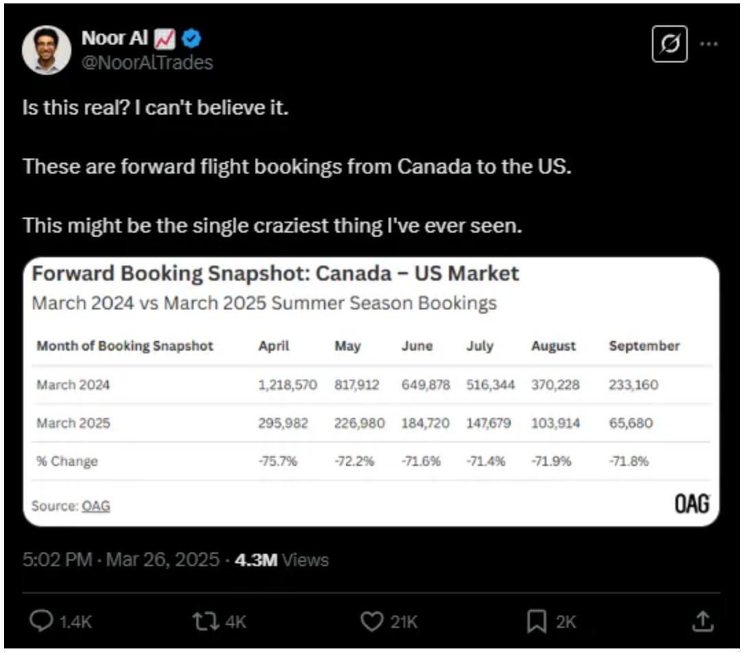 Showing a 70 percent drop from last year on air travel bookings from Canada to the USA.