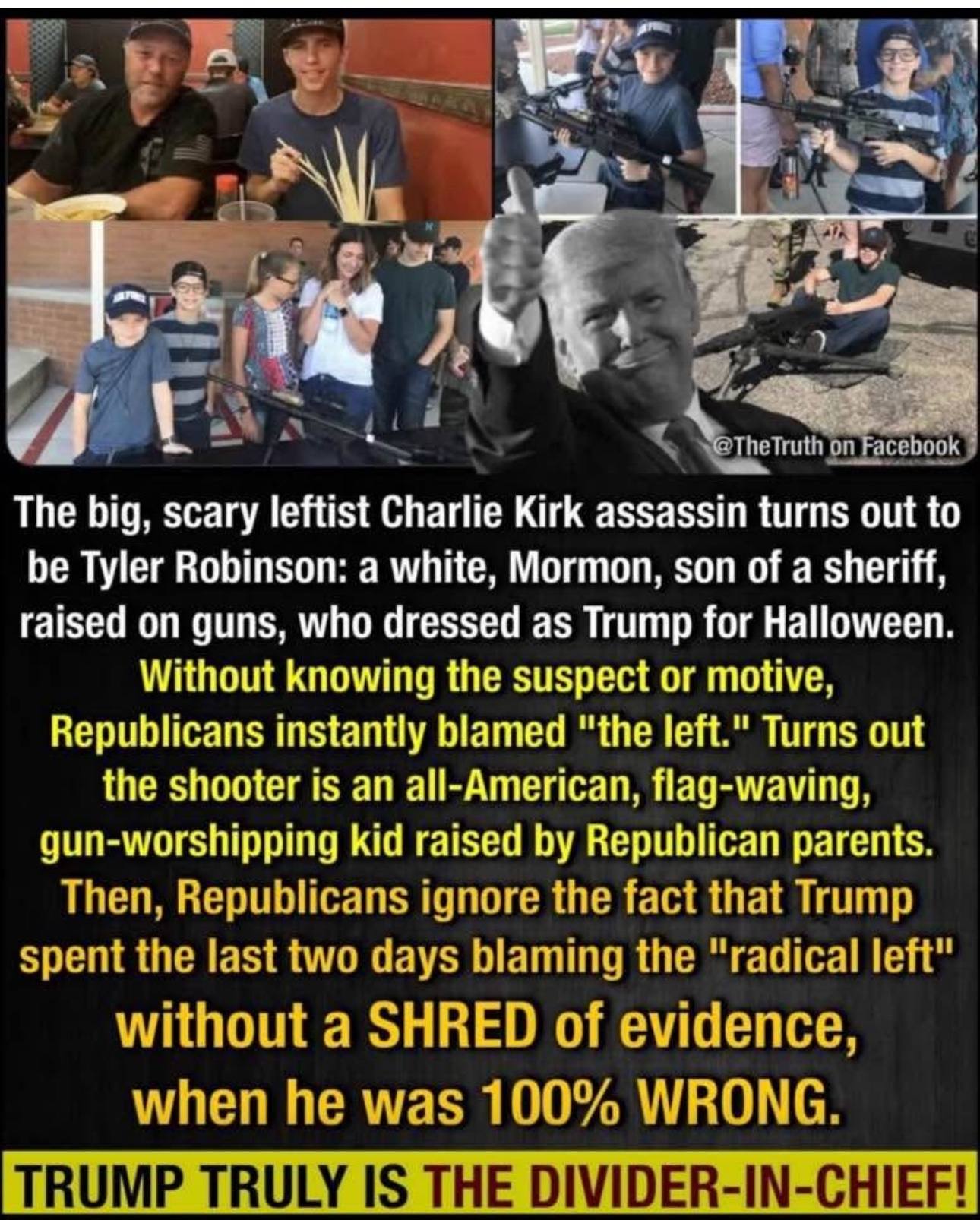 Could you imagine this guy being in public office???dorankj wrote: Fri Sep 12, 2025 6:27 pm Except Ray ( and most of you) like usual are exactly wrong! His father/home were traditional and more conservative but the authorities clearly stated that he became radical, far left and 'antifa' as evidenced by his bullet casing inscriptions. But hey, don't let the truth get in the way of your bull*** lying narrative that protects your so delicate 'sensibilities ' and helps you sleep with all your lies, attacks and rhetoric to stir up and cause exactly what happened here. YOU are the true fascists and have NEVER believed in democracy, only autocracy as long as you are in POWER over everyone else.