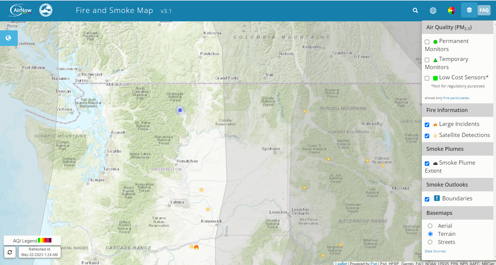 The AirNow website publishes a smoke map (pm2.5 particulates) updated frequently... Here is May 22 early morning..