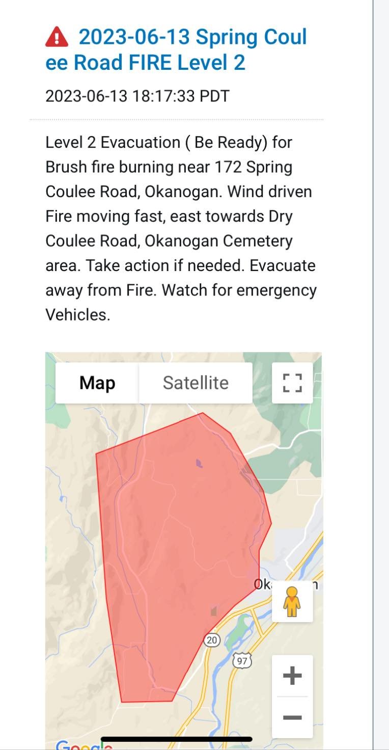 As of 4:30 PM today, Wednesday, June 14th the Level 1 (Advisory) has been lifted for the Spring Coulee Fire.