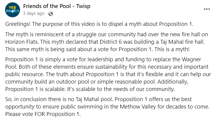 pasayten wrote: Thu Oct 12, 2023 10:37 pm October 12th post... A little confusing as a vote on Prop 1 is not actually to approve a "levy" to create a recreation district. Campaign Manager? Should know more facts about Prop 1 and RCW 35.61 Metropolitan Park Districts. We all want a pool... Just build one without an MPD... There are plenty of other options.