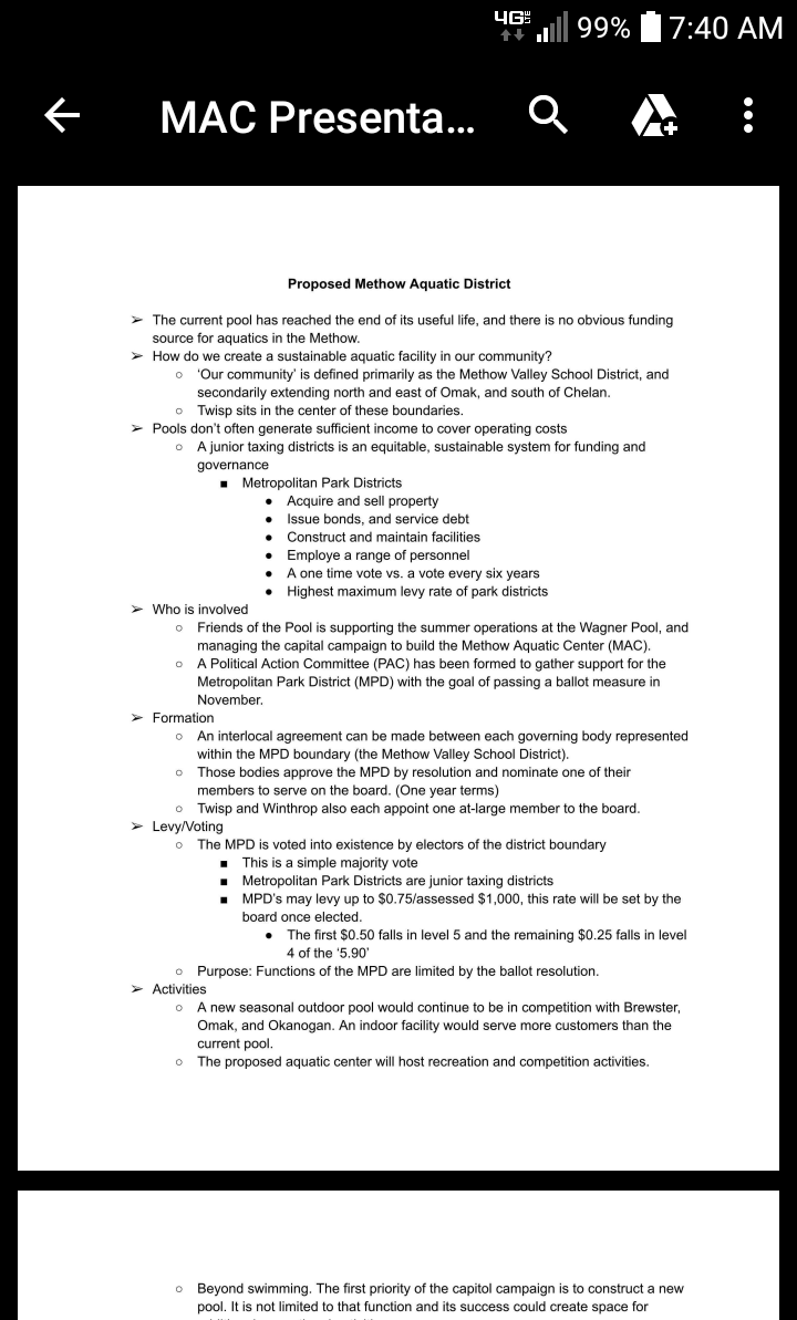 "The Methow Aquatics District is a critical first step in the process. It will lead the community in deterring the final design, size, phasing and costs of a future pool."