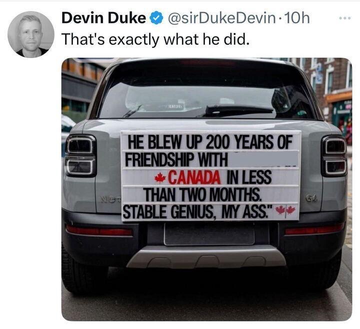 In Trump's own words, "The only thing that makes sense is for Canada to become our cherished Fifty First State. This would make all Tariffs, and everything else, totally disappear. Canadians’ taxes will be very substantially reduced, they will be more secure, militarily and otherwise, than ever before, there would no longer be a Northern Border problem, and the greatest and most powerful nation in the World will be bigger, better and stronger than ever — And Canada will be a big part of that. The artificial line of separation drawn many years ago will finally disappear, and we will have the safest and most beautiful Nation anywhere in the World — And your brilliant anthem, “O Canada,” will continue to play, but now representing a GREAT and POWERFUL STATE within the greatest Nation that the World has ever seen!"