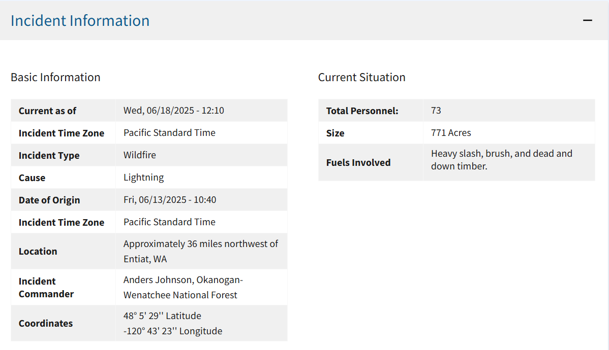 Weather and Smoke conditions: There is a Red Flag Warning in place today for winds and low relative humidity at lower elevations from 1 to 11 PM. Temperatures will be cooler than yesterday, with breezy to gusty northwest to northeast winds forecasted for this afternoon and evening. Smoke may become more visible from nearby communities, including Entiat, Chelan, and Winthrop. Learn more about smoke at the Washington Smoke Blog.
