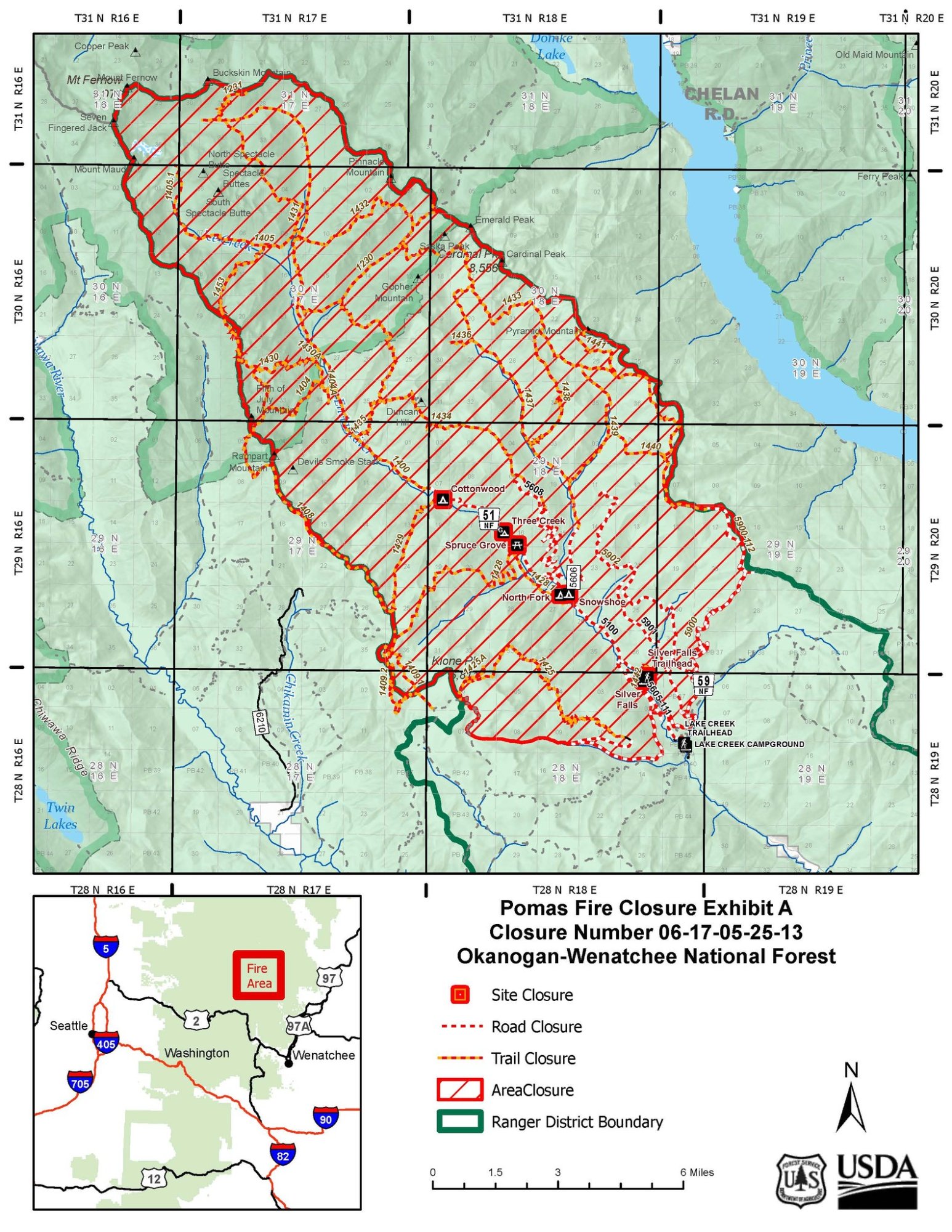 Closures: The Glacier Peak Wilderness on the Entiat Ranger District, including Ice Lakes, Silver Falls Trail and Campground are closed. The fire is 12 air miles from the Pacific Crest Trail and currently poses no threat to that trail.