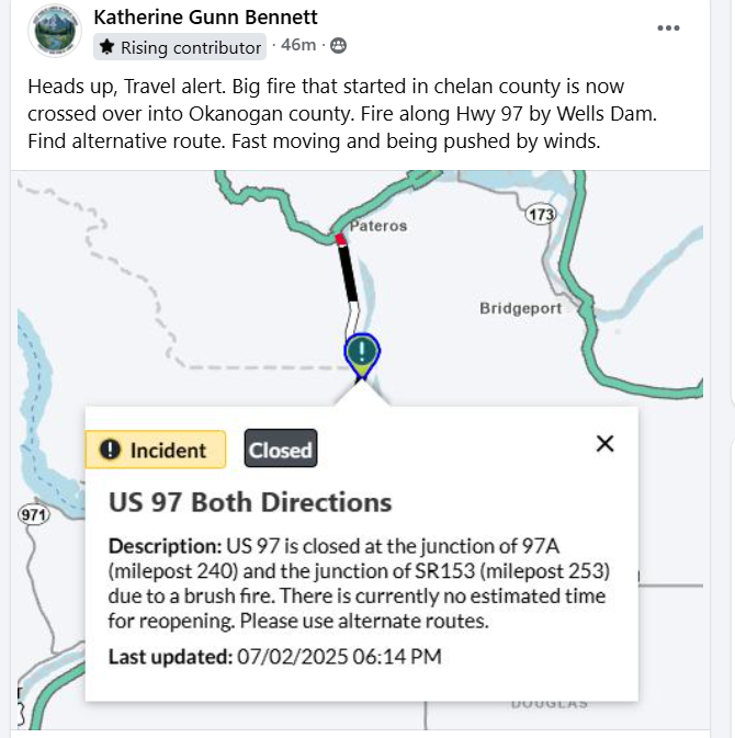 Re: Hwy 97 closed near Pateros/Wells Dam due to Apple Acres fire