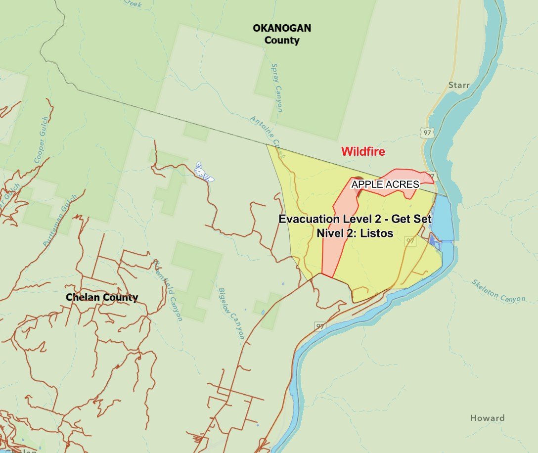APPLE ACRES ROAD: Antoine Creek, from Apple Acres Road to Quiet Valley Road in Okanogan County, is on a Level 2 evacuation notice. Level 2 asks that people in the impacted area be prepared to leave if the fire should approach their properties. This is a change from the previous fire advisory for much of that area.