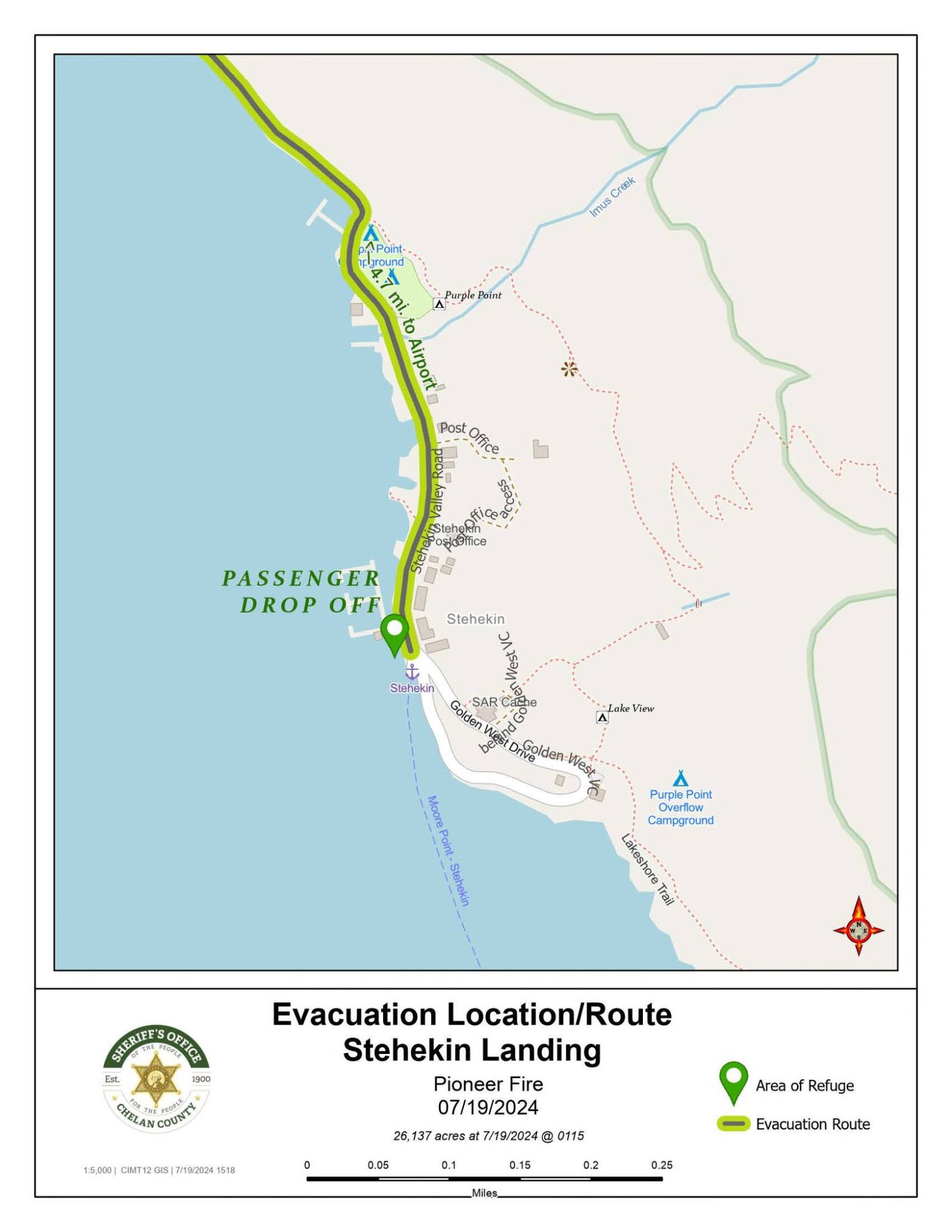 Areas of Refuge, with shuttle service, have also been established at the Stehekin Ranch, airfield, Buckner Orchard and Stehekin bakery. See the attached evacuation routes and locations.