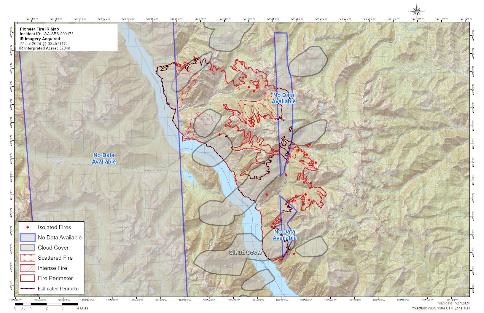 The Pioneer Fire crossed Fourmile drainage yesterday and progressed further north. This fire movement has prompted @Chelan County Emergency Management to issue a Level 3 (Go Now) notice for Stehekin starting July 28 at 8am. For more details about the notice and transport information see https://www.facebook.com/CCSOEM/posts/p ... PUJTBzqTTl