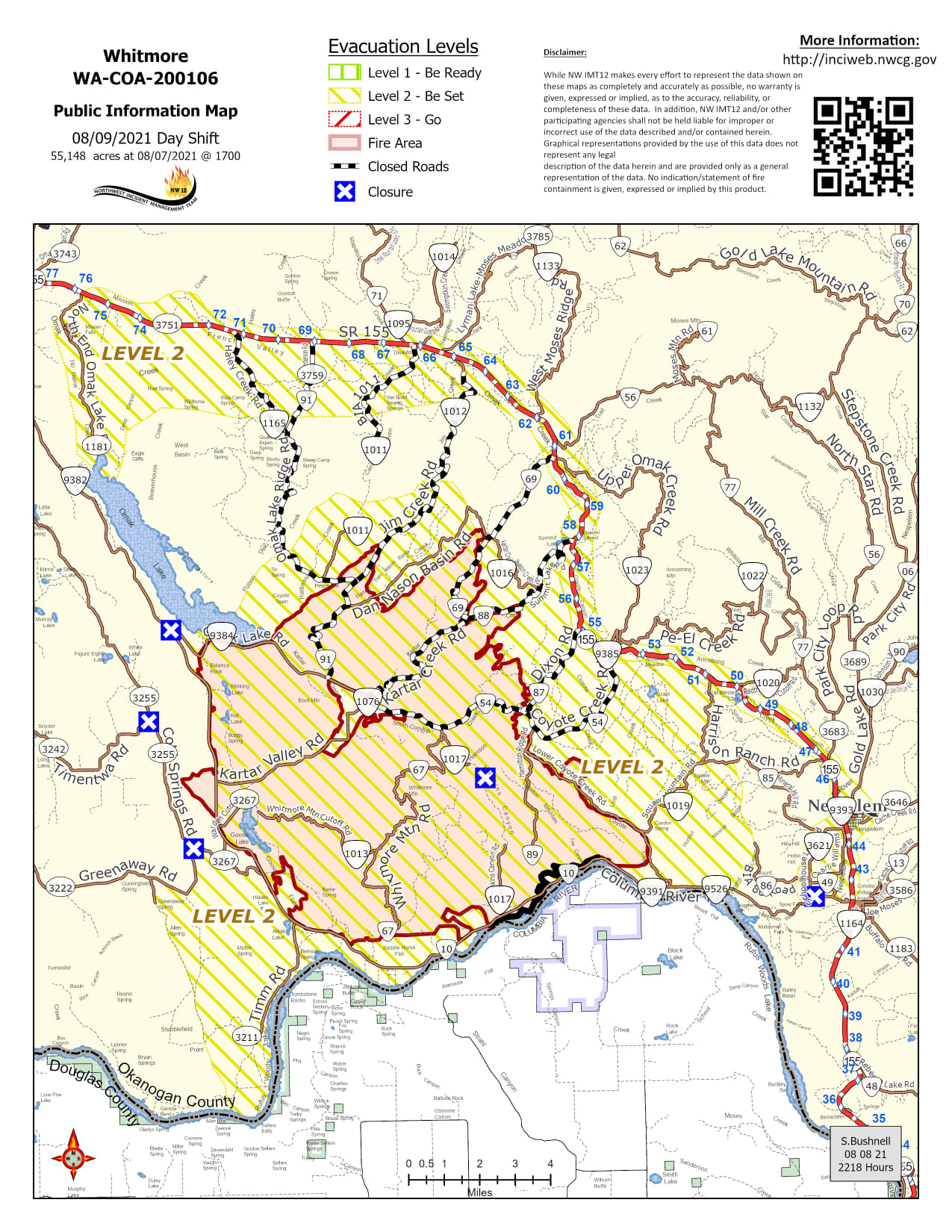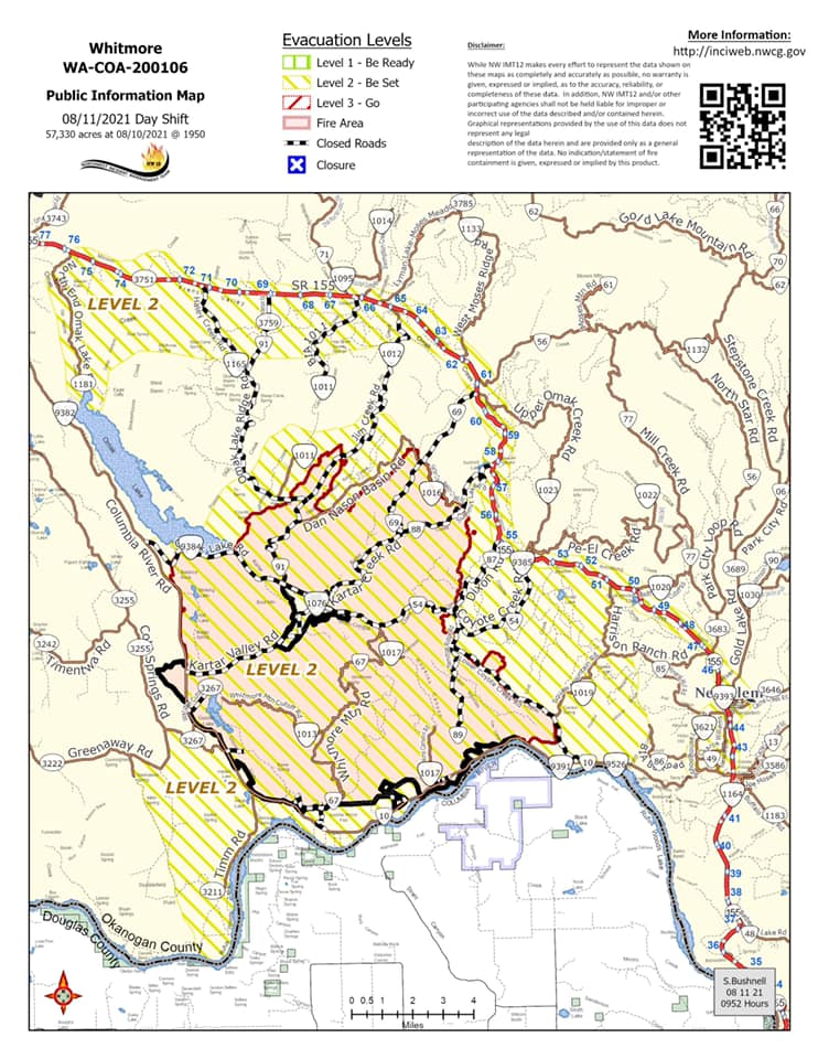Level 2 evacuations are still in place for the Columbia River Road corridor, Kartar Valley, Colville Agency, the community of Nespelem, and the SR155 corridor from Colville Agency north up to the Mission.