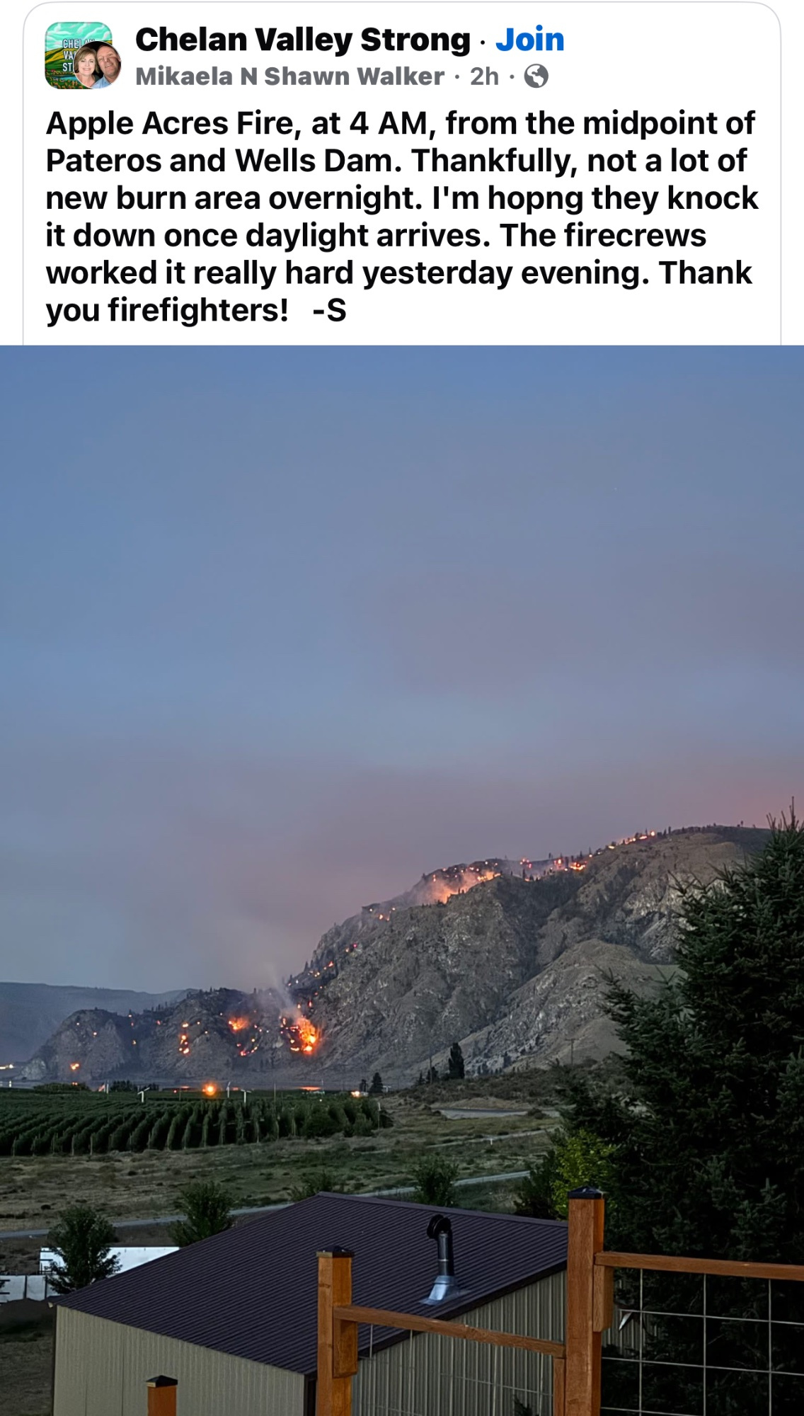 Apple Acres Fire, 4:30 AM, from just south of Pateros. Wells Dam is just out of frame on the left. Less smoke today...almost smells like rain! Thank you Firefighters. -S