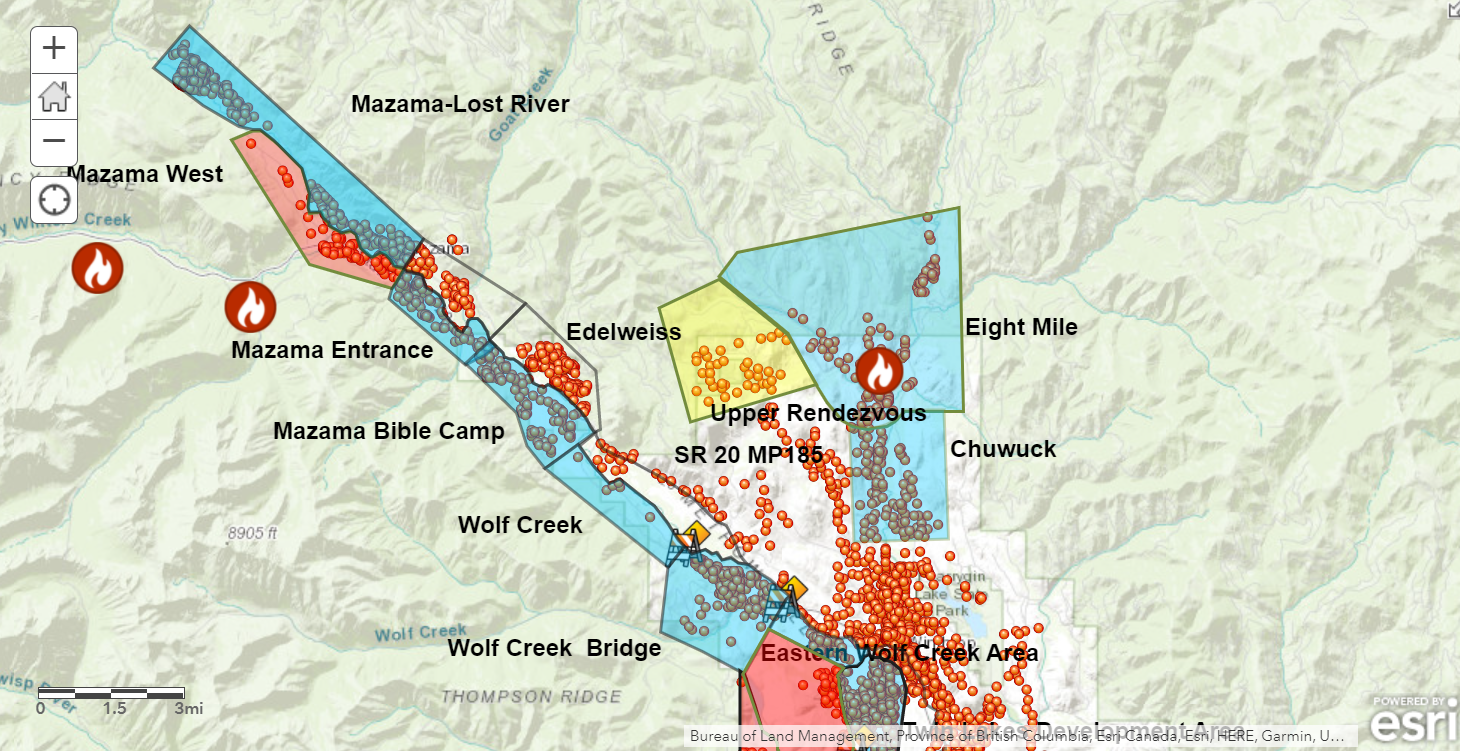 The Forest Service Fire Emergency Area Closure is separate from the Washington State Department of Transportation’s (WSDOT) closure of portions of State Route 20 and may change or be lifted at various times depending on operational needs. WSDOT is working closely with the Forest Service and Okanogan County to identify where fire activity and firefighting operations warrant closure.