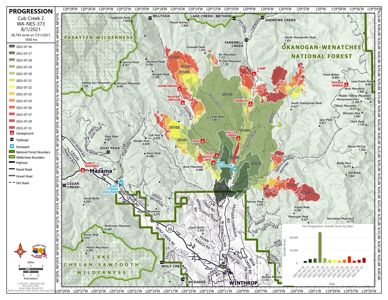 Public Meeting: A public meeting hosted by the Southwest Area and Great Basin IMTs was held yesterday evening at Mack Lloyd Park in Winthrop. The Incident Commander and Operations Section Chief for each team gave updates on their fires. Okanogan County Emergency Manager Maurice Goodall discussed evacuations. The teams had their Incident Meteorologist, Fire Behavior Analyst, Air Quality Specialist, and Medical Unit Leader on hand to answer questions. Representatives from the US Forest Service, Okanogan County Fire District 6, and Washington DNR were also present.