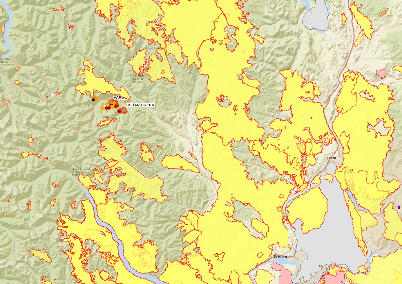 We live in interesting times in the Methow. Here are the two current fires (red/orange dots) mapped in the context of fire perimeters (yellow polygons with red outlines) from the past 20 years. Needles, Tripod, Carlton, Rising Eagle, McCleod, Crescent, Little Bridge Cr, Texas Cr, Cold Springs, etc.