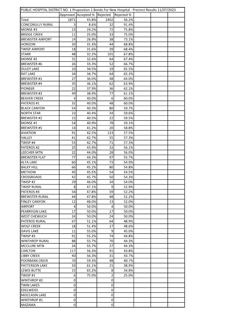 The Hospital Proposition 1... Some precincts approved the Proposition, but only 3 over the required 60% threshhold...